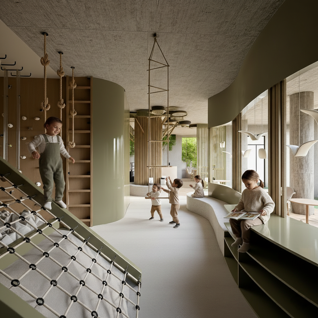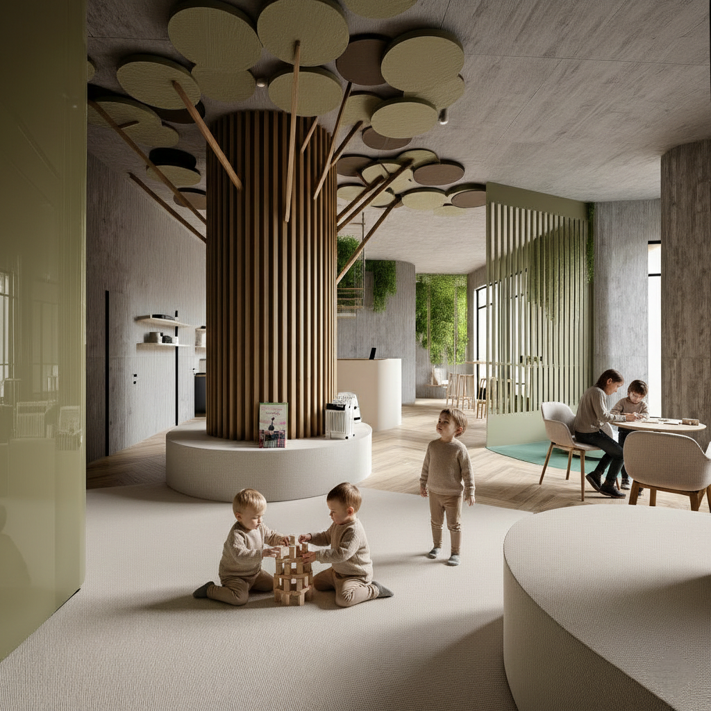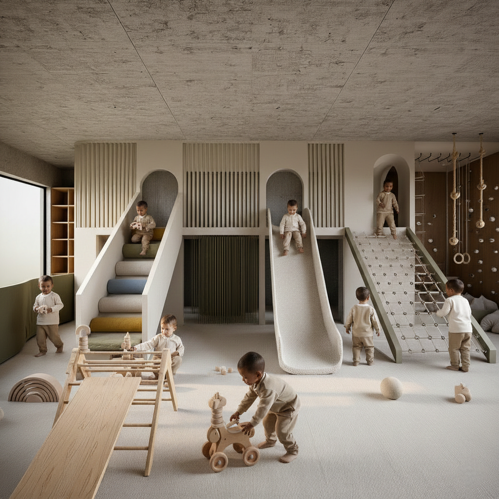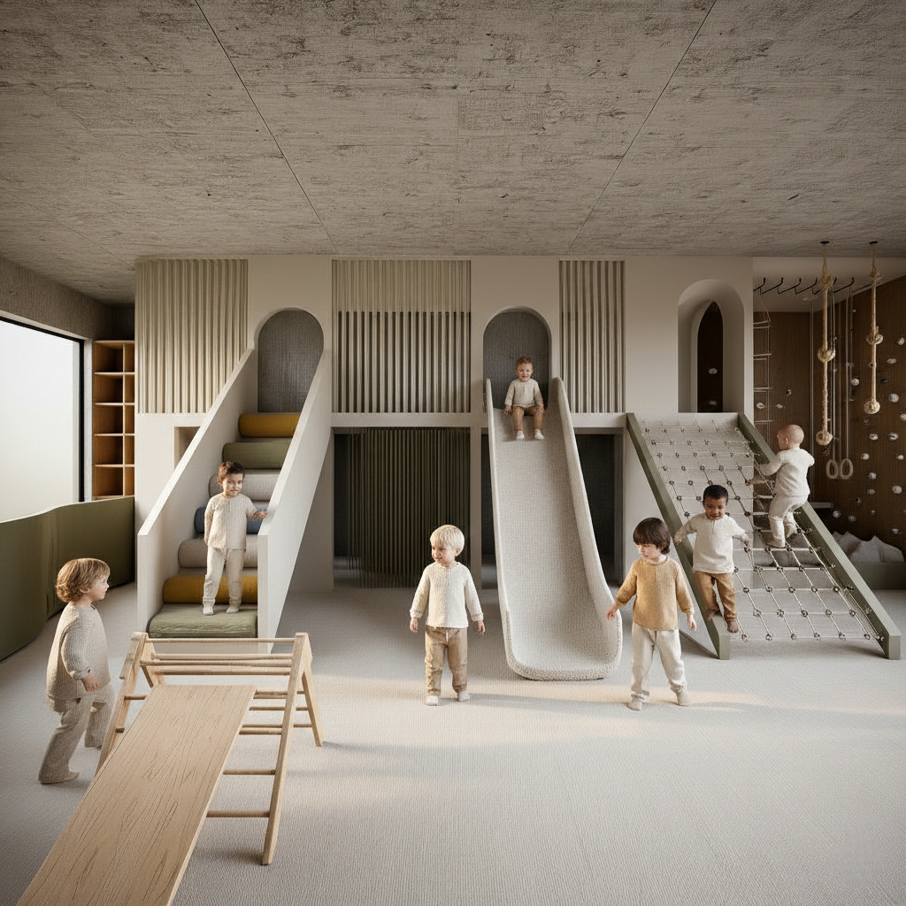 Rozdelili sme ho na viacero hravých sveto od mäkkej Baby zóny, cez chill kútik, až po dve úrovne preliezok pre deti 1–3 a 3–6 rokov. Nechýba ani Snoezelen miestnosť, malý čítací kútik, tvorivé stanovištia, balančné prvky či magnetické a LEGO steny.